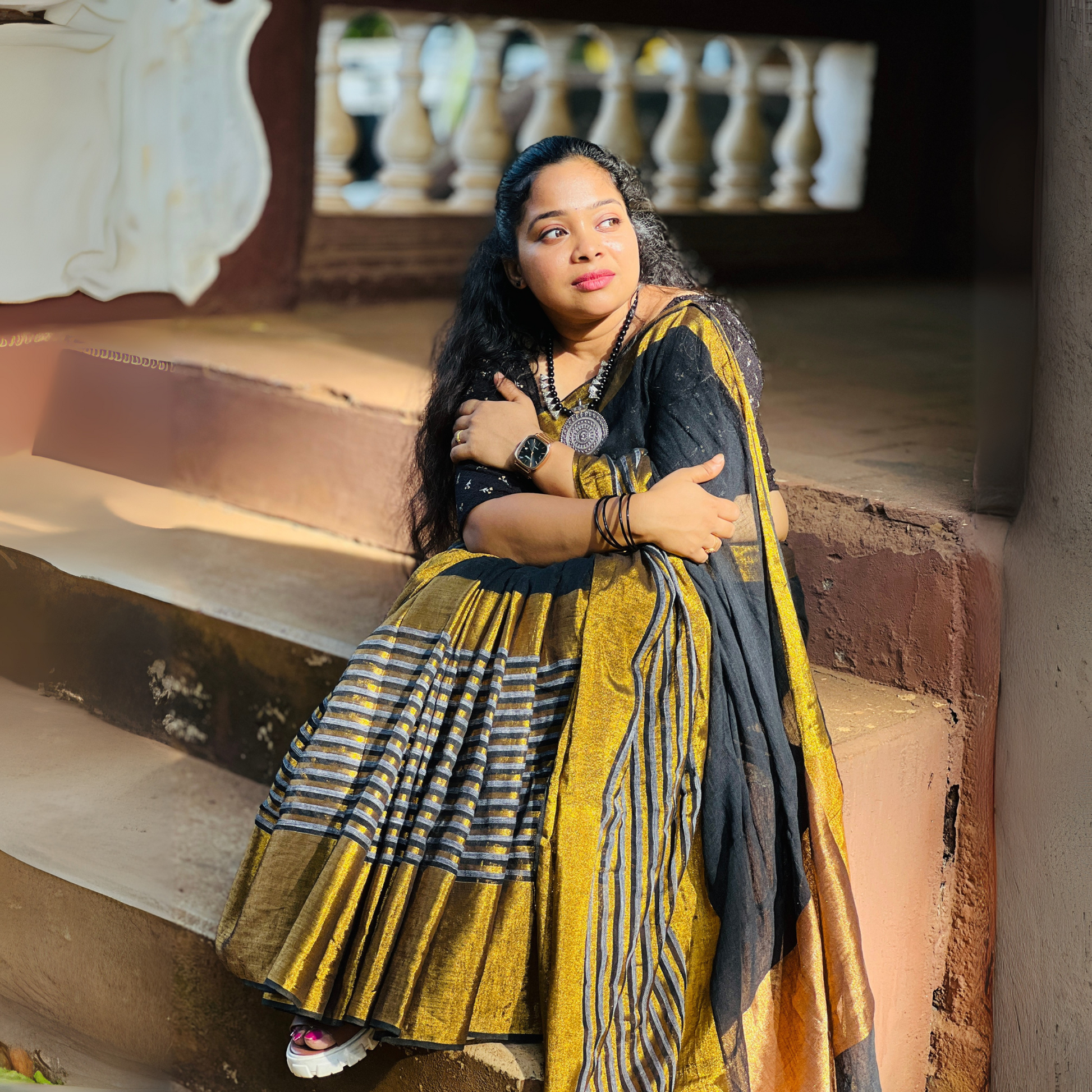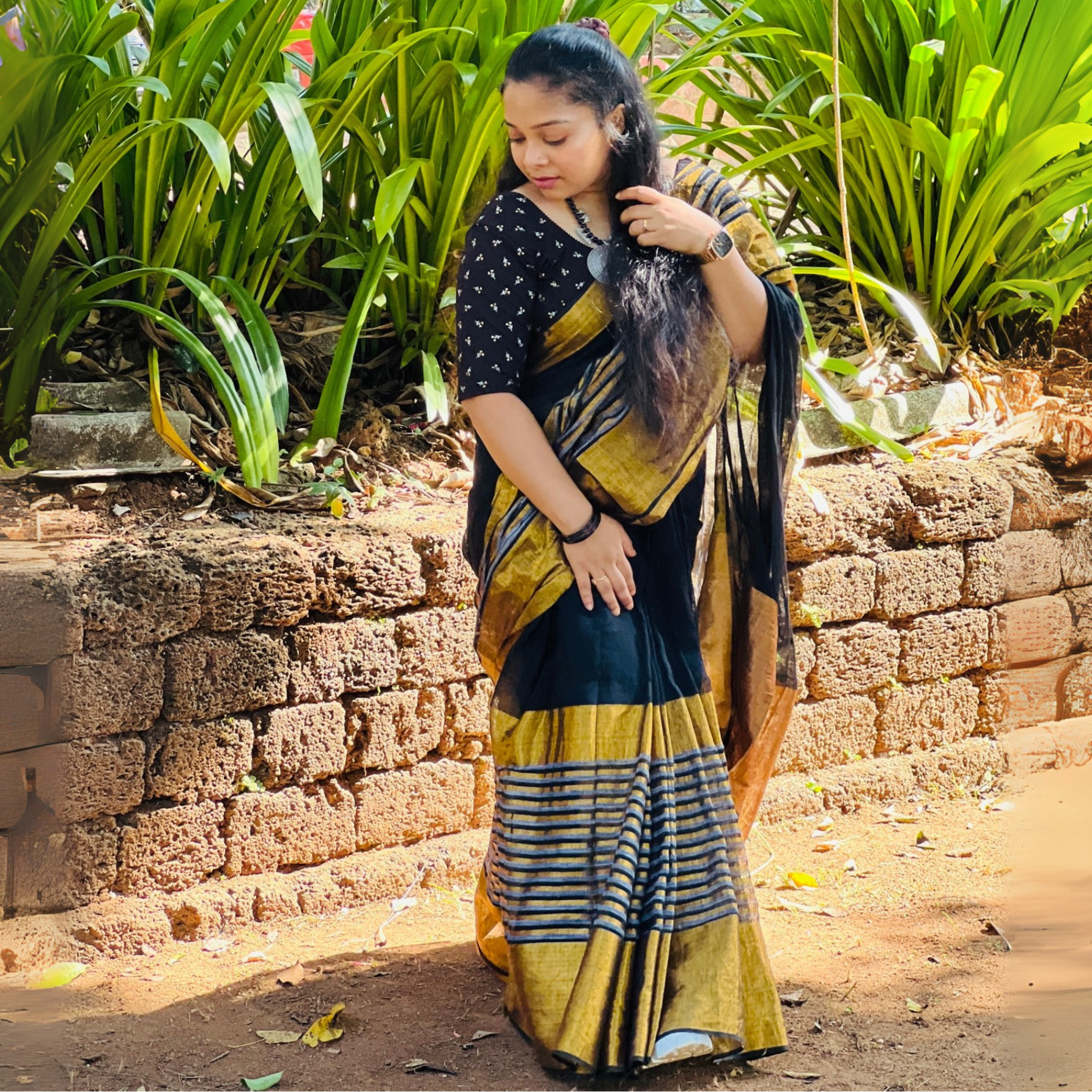 The Bhagya Black Saree is made from pure linen fabric, which is soft, light, and comfortable to wear. It comes in a rich blue color with shiny gold and silver zari borders.