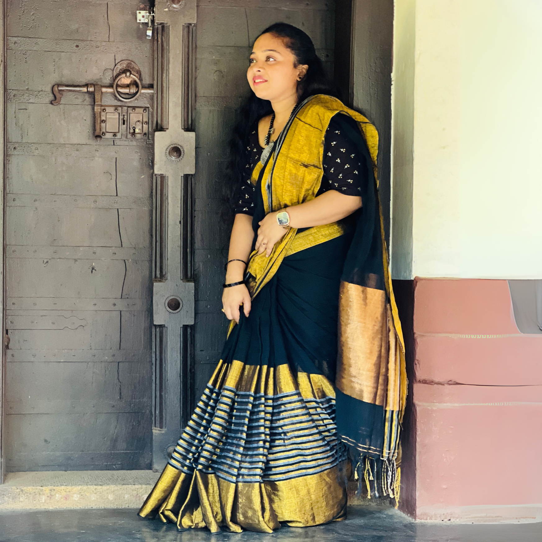 Pair it with antique or terracotta jewellery, a neatly tied bun or braid, and a smart blouse (elbow sleeves or high neck) for a classic yet stylish look. Add a small bindi to complete the traditional vibe.