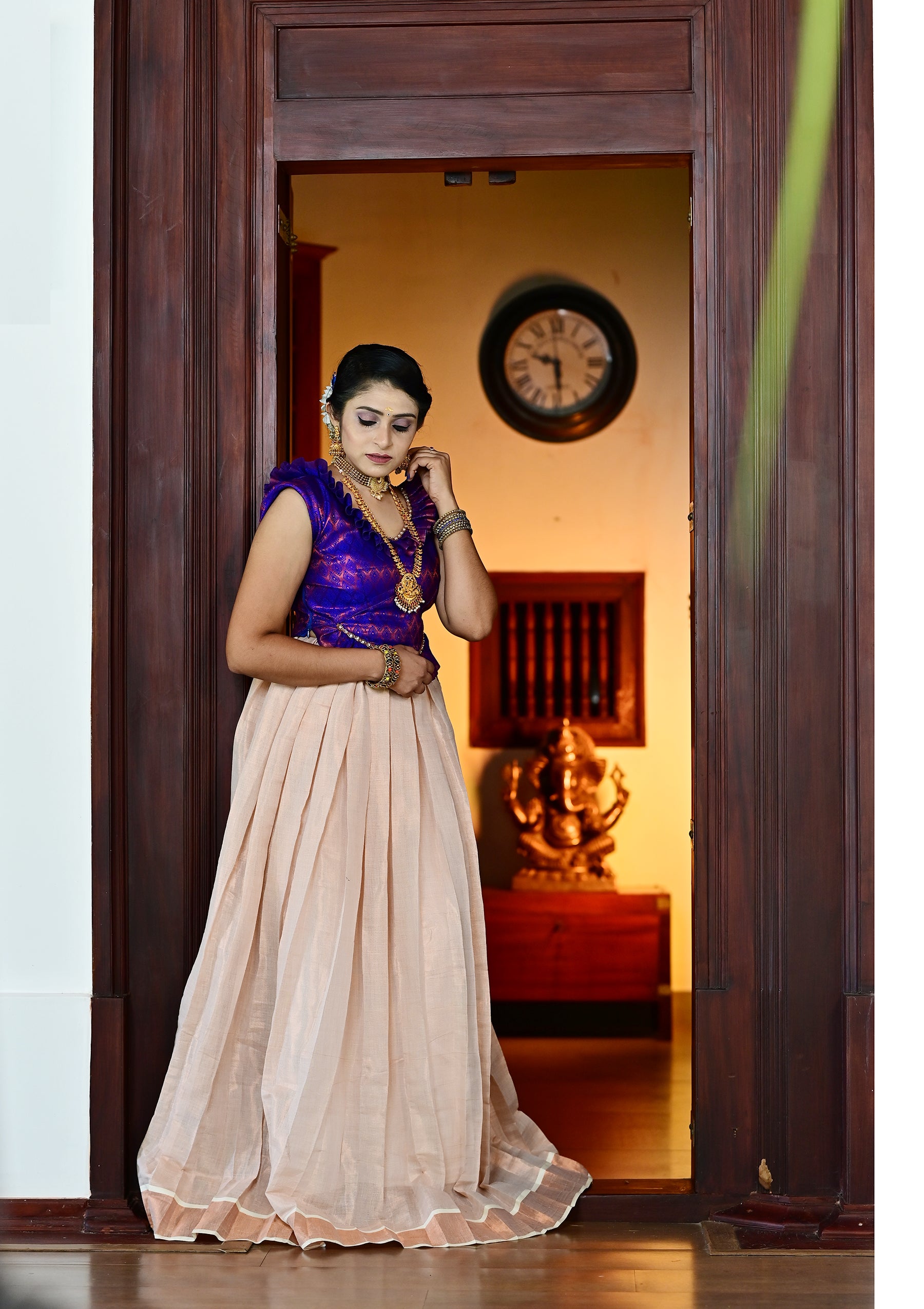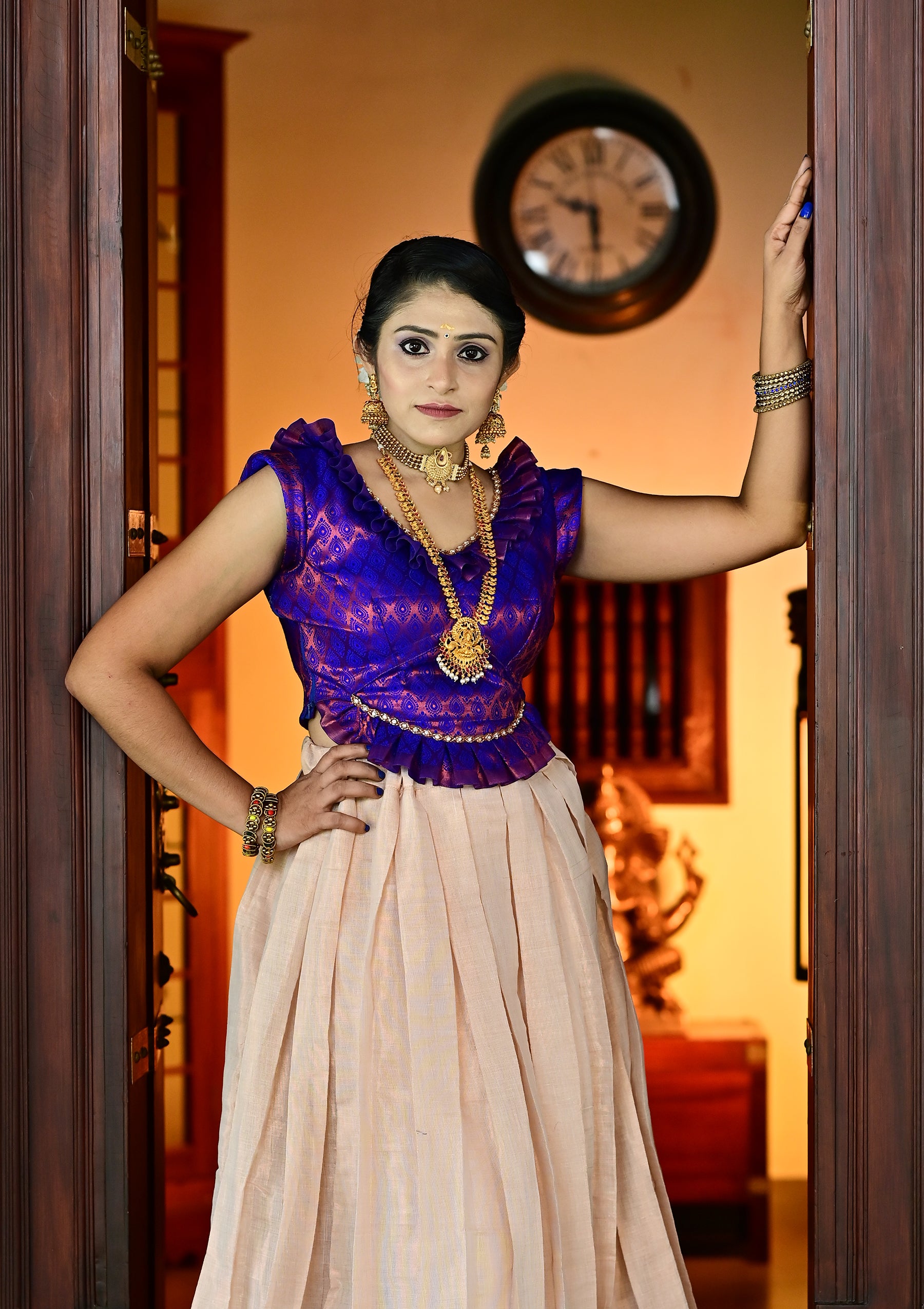 The Blue Traditional Pattupavadai set is the perfect blend of tradition and style. Made with brocade silk fabric and tissue silk PattuPavadai. Its vibrant blue color is sure to make you stand out while providing a traditional look.