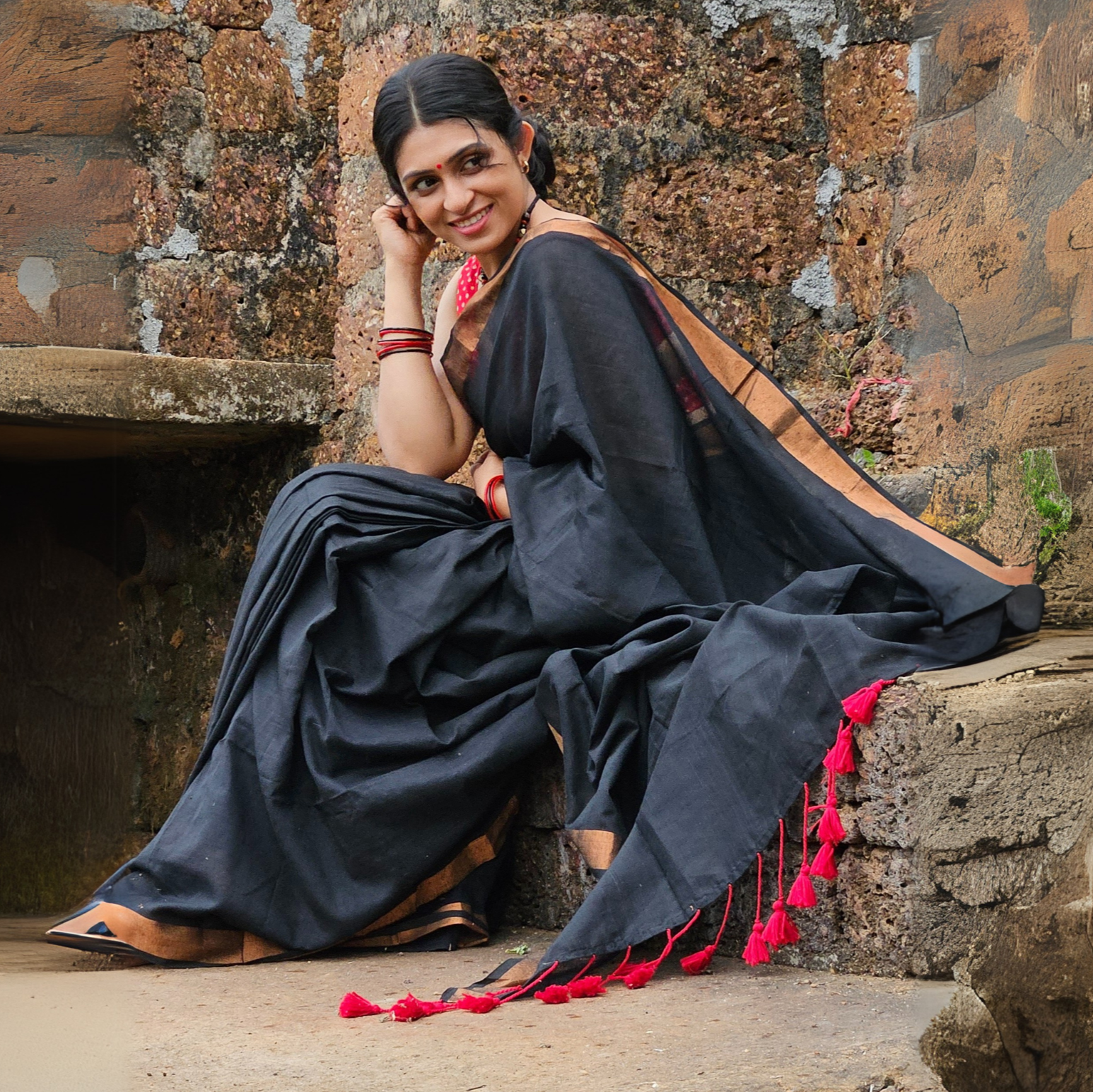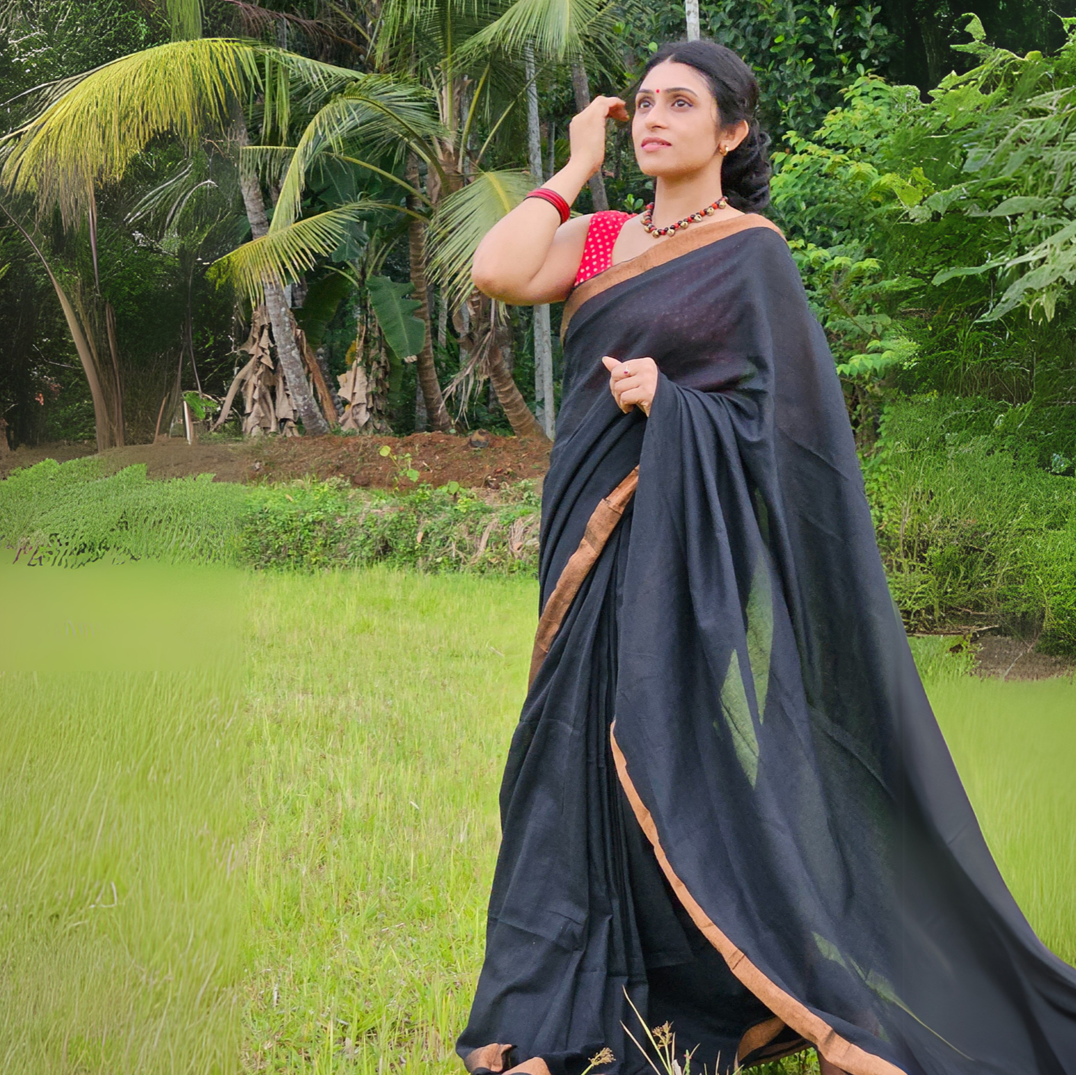 This is a beautiful black saree made from soft and breathable khadi cotton fabric. It has a smooth yet slightly textured feel, giving it a natural and elegant look. The border is woven with shiny copper zari, adding a touch of rich, traditional charm. The pallu ends with neat tassels, giving the saree a graceful finish. It's perfect for office wear or special occasions, offering comfort and class in one drape.