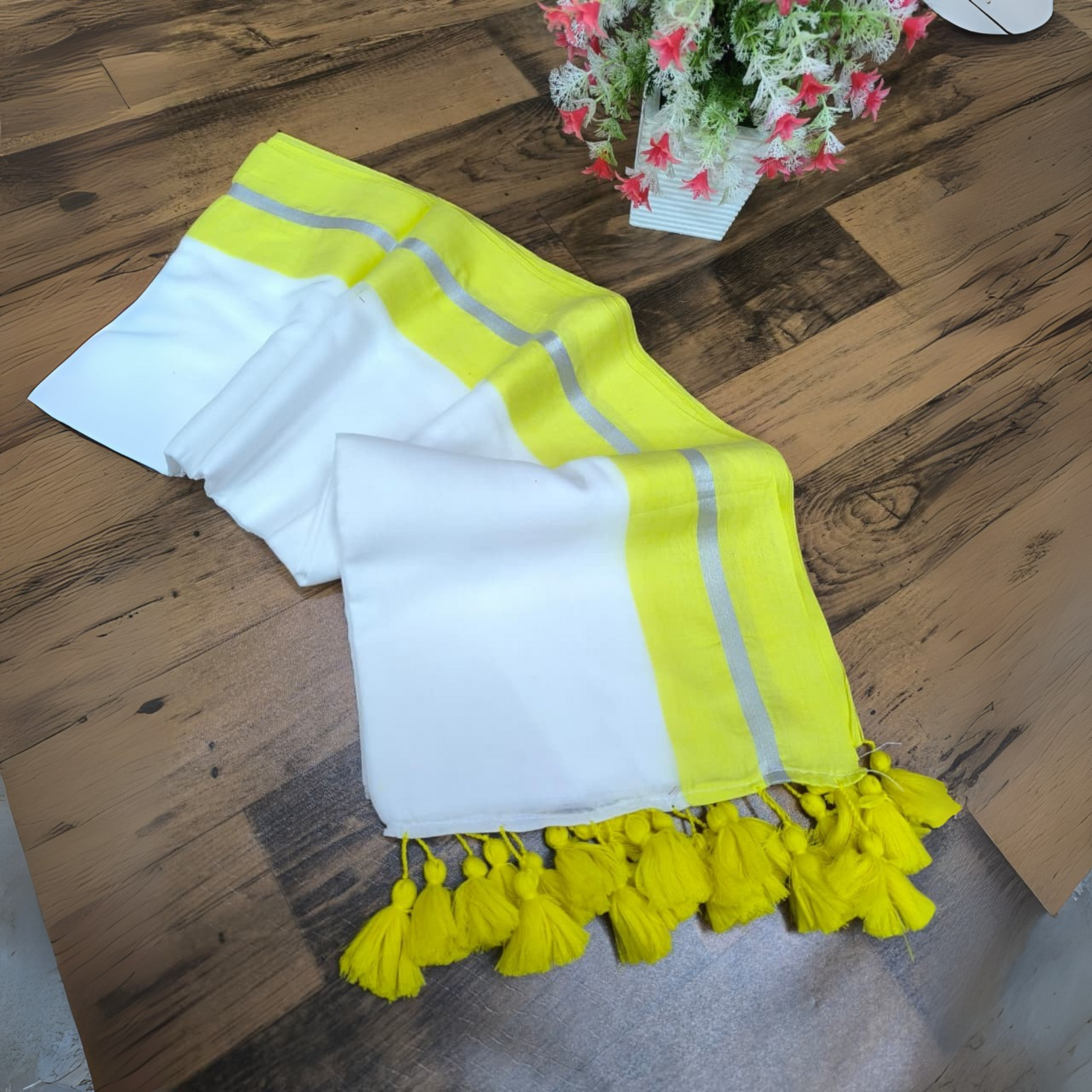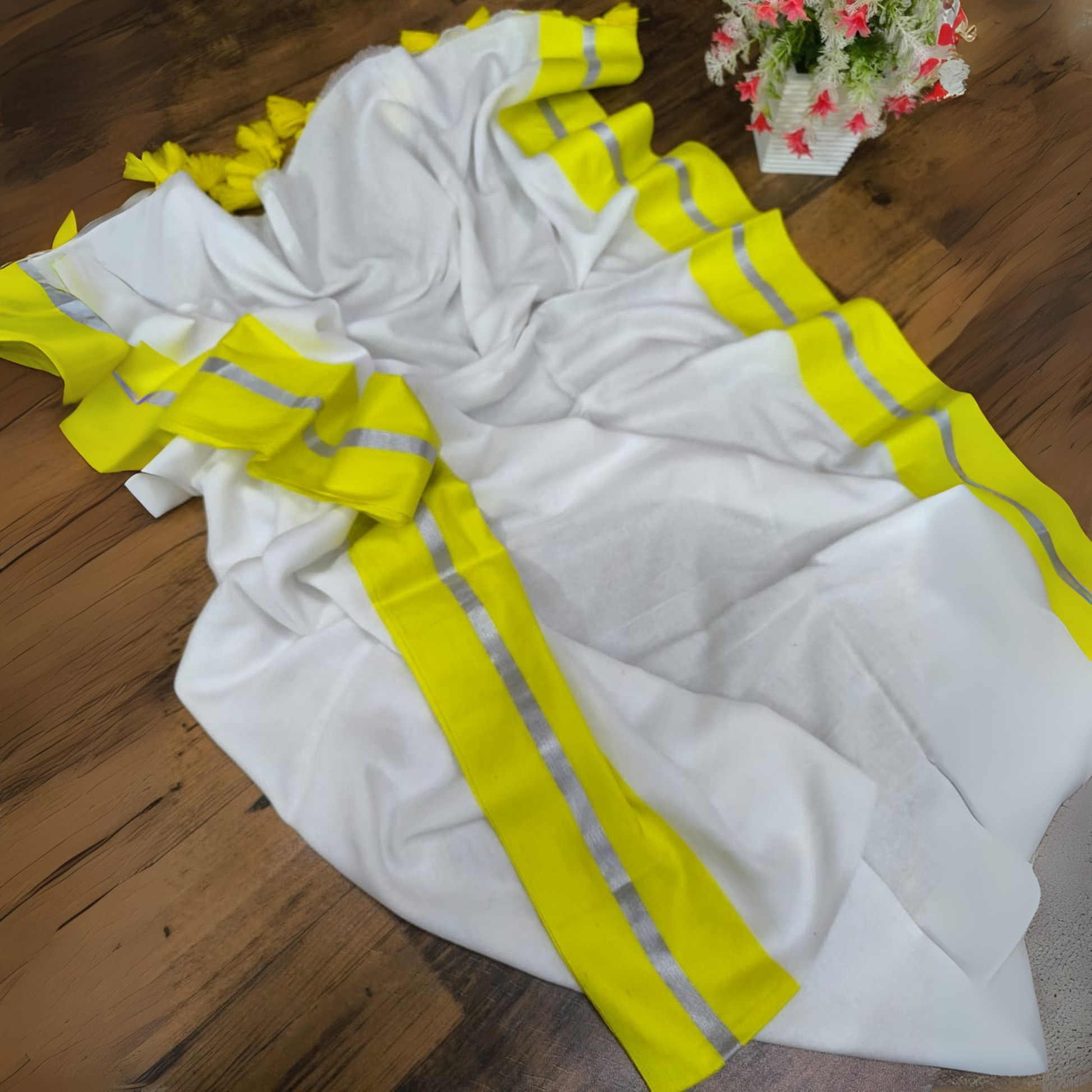 White Mul Cotton Saree with Yellow boder with silver zari lines