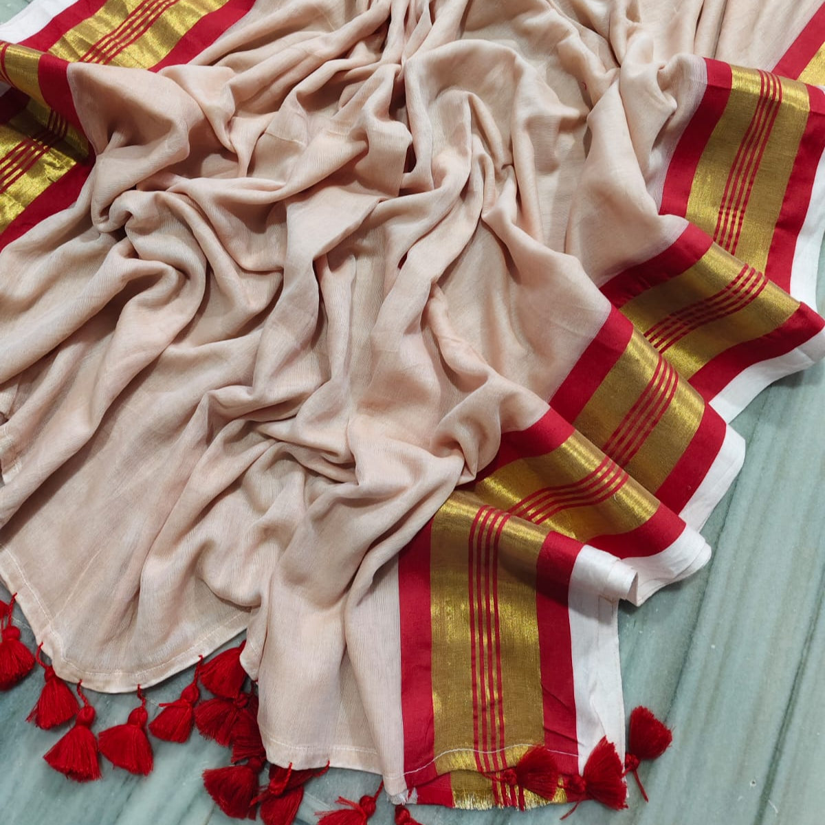 Beige Mul Cotton saree with gold & Red Double zari border