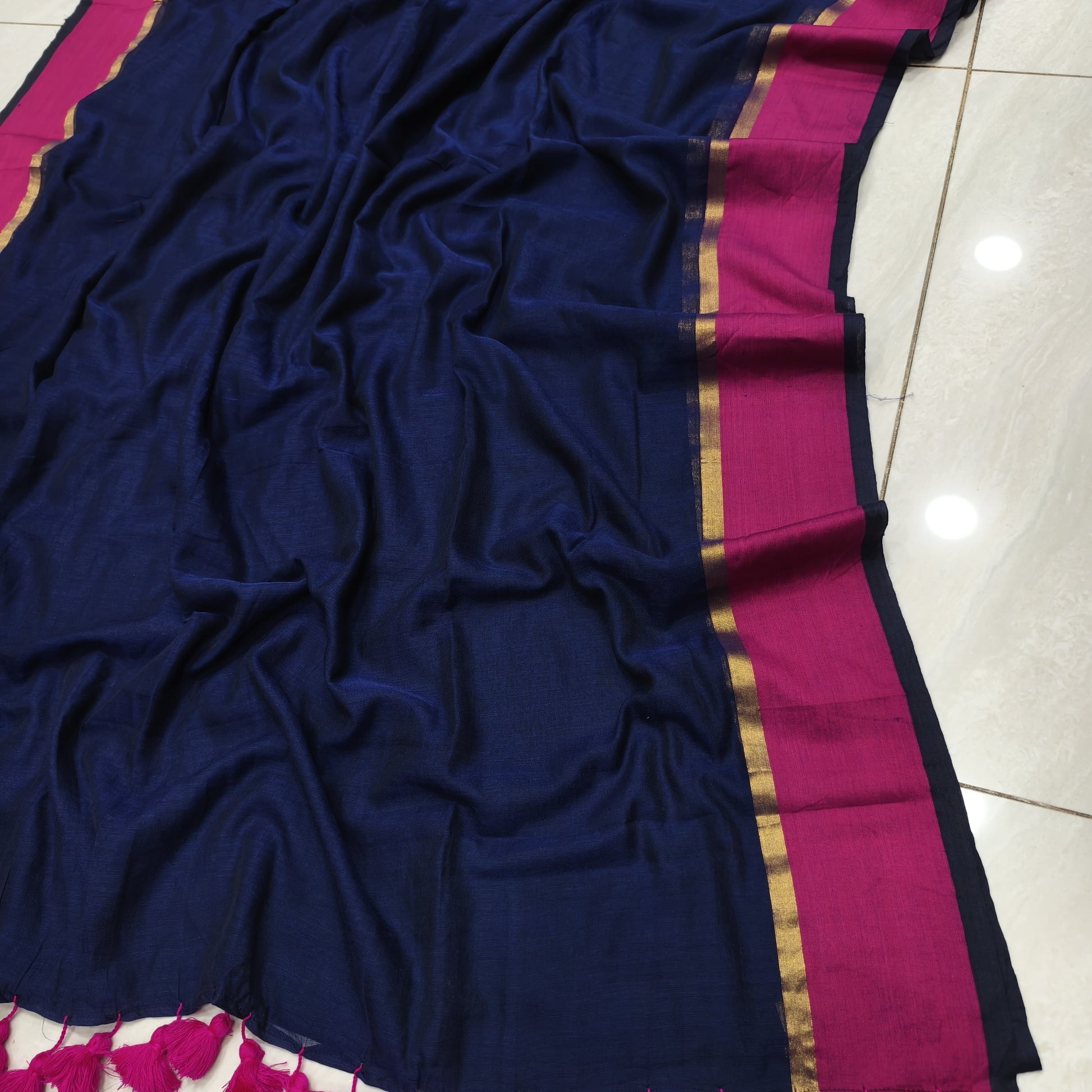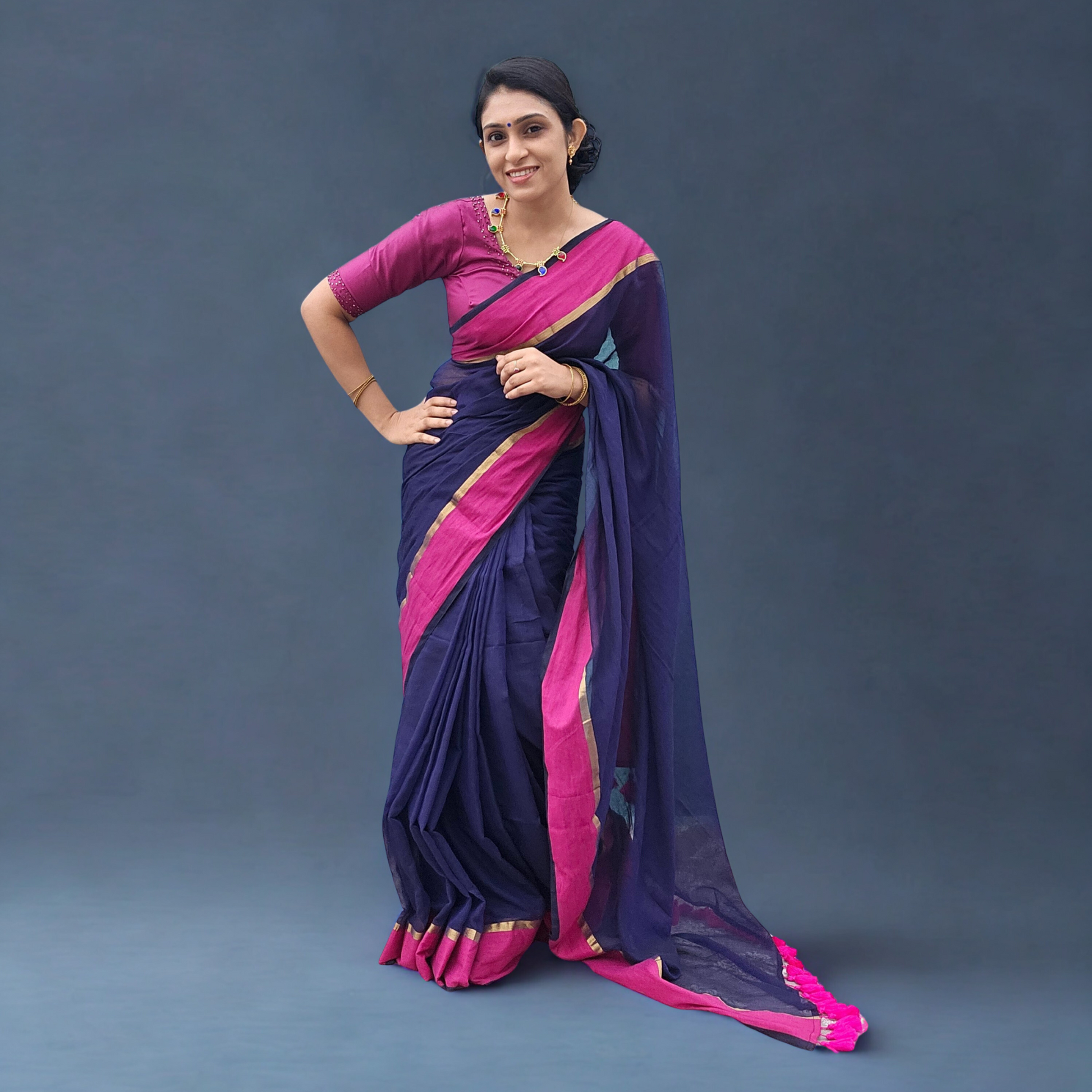 A soft navy blue saree with a vibrant pink border, golden zari line, and tassel edges. Lightweight, breathable, and perfect for daily wear or festive charm.