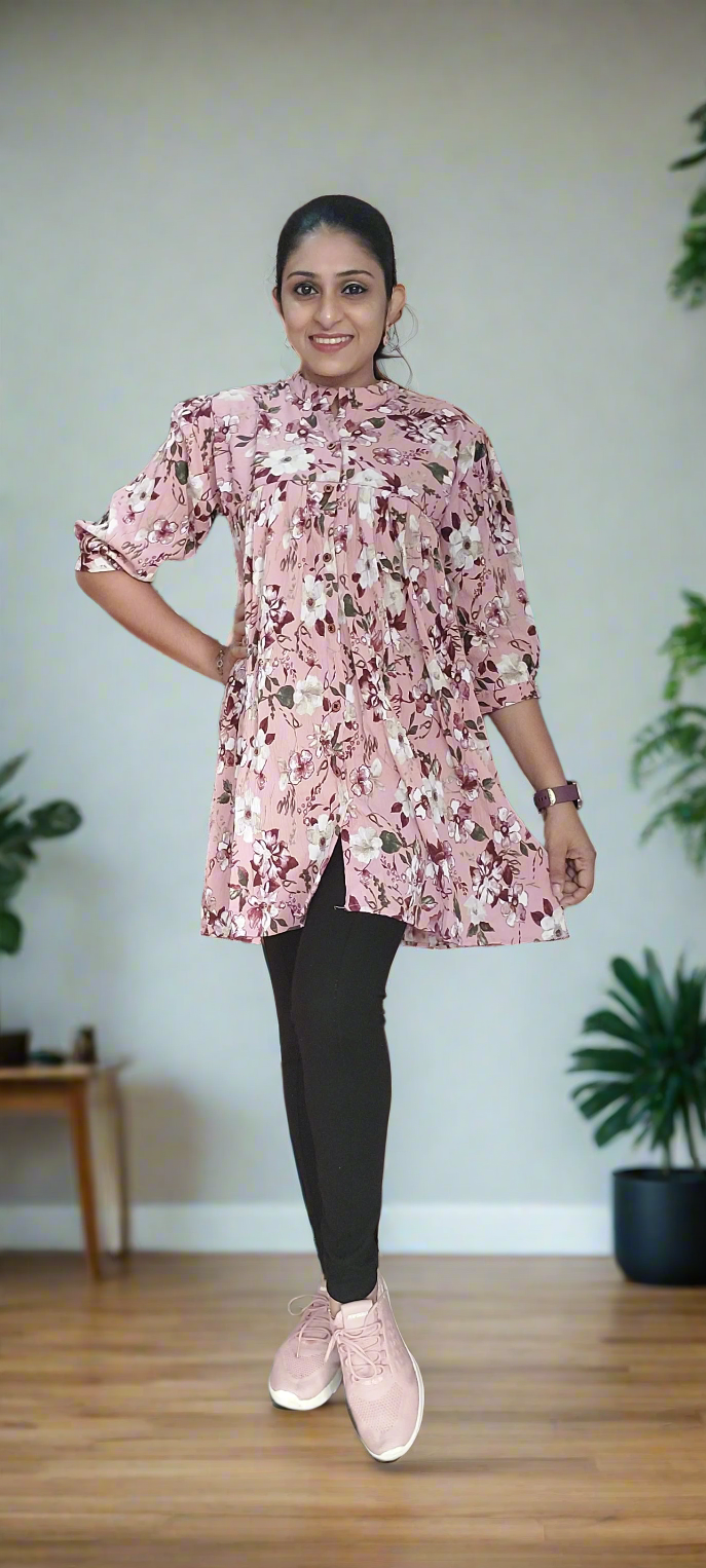 Introducing our Pink Floral Short Kurti, the perfect mix of style and comfort. Made with crushed rayon fabric with gorgeous floral print, Collar neck with buttons and a layer of frills at the bottom. This short kurti is perfect for any occasion.