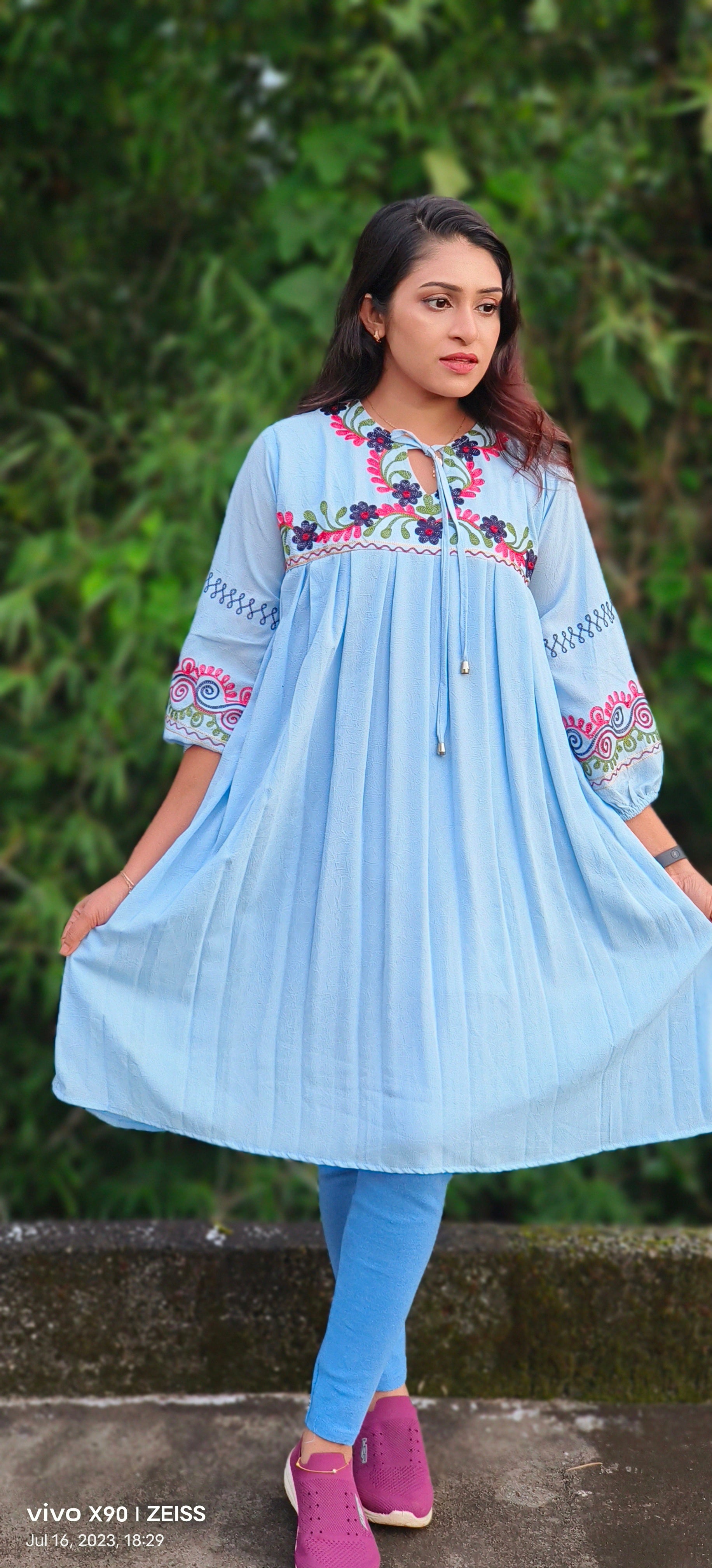 This Sky Blue Embroidery Short Kurti features beautiful bishop sleeves and a lightweight georgette fabric. Perfect for any occasion, its floral embroidery adds a touch of elegance to your outfits.