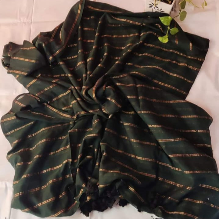 This beautiful saree is made from Khadi by Cotton, which feels light, breathable, and comfortable for daily wear. The olive green color gives a classy and natural look. It has zari lines all over the body and Elegant Pallu with tussles