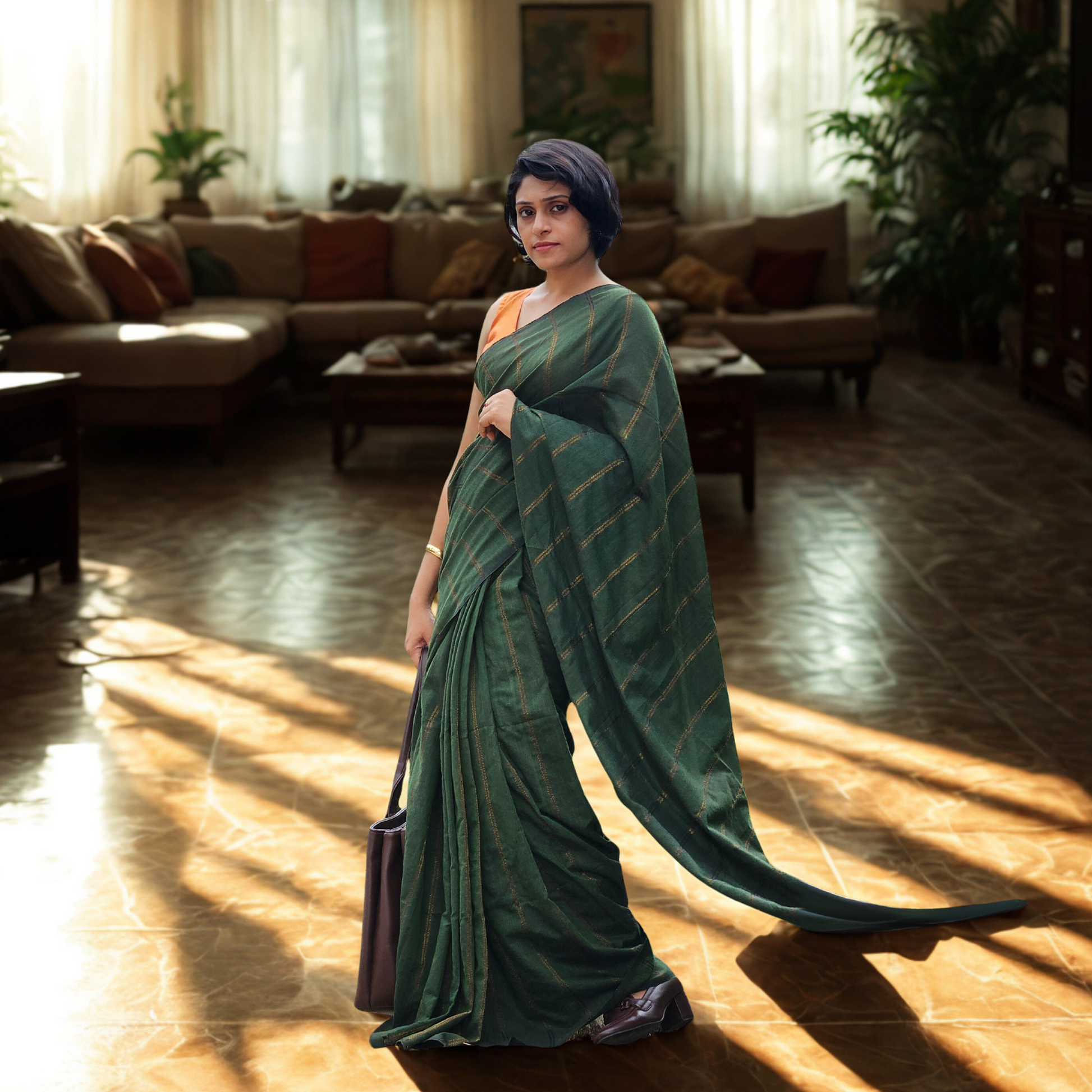 Style with oxidized or terracotta jewelry, a sleek bun or braid, and a contrast blouse (elbow sleeves or high neck) for a timeless handloom look. A small bindi will add to the natural charm.