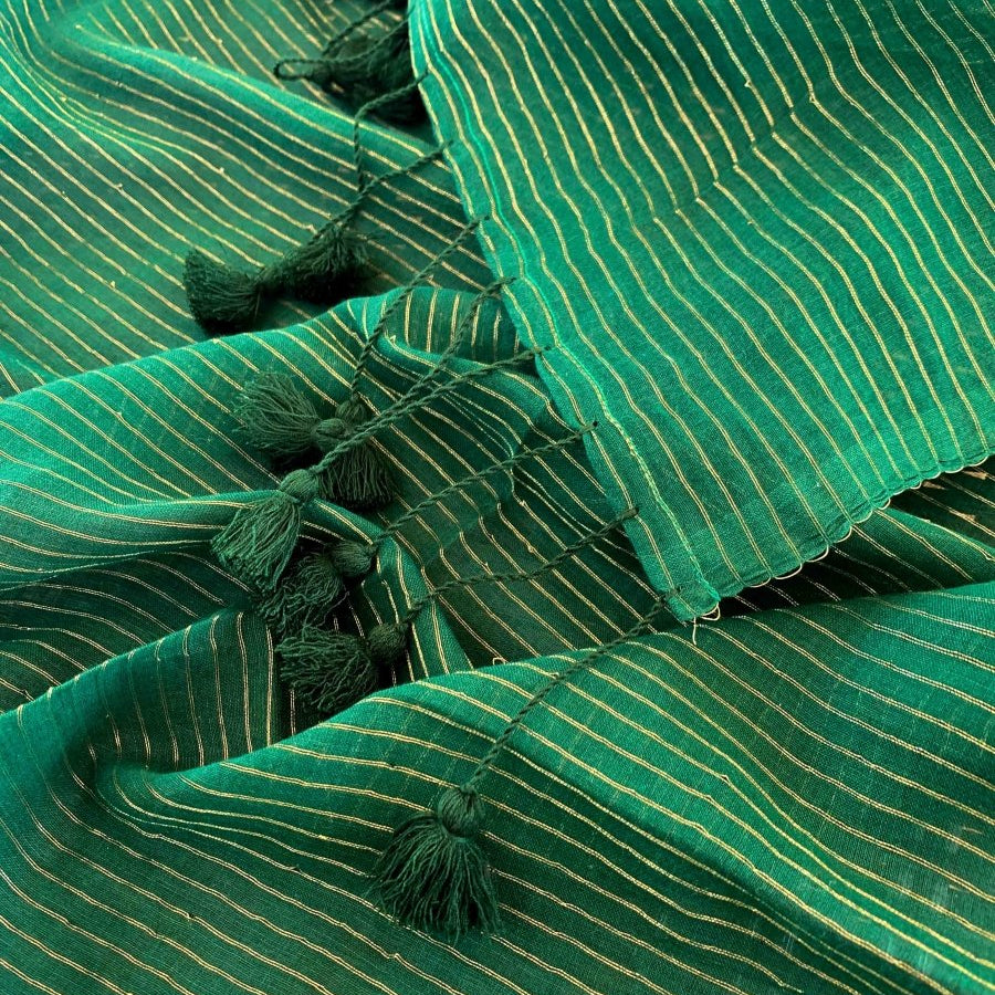 This is a beautiful Red saree made from soft and breathable khadi cotton fabric. The body is woven with shiny golden zari lines, The pallu ends with neat Violet tassels.